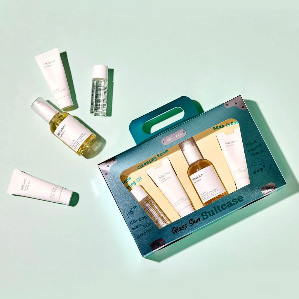 Los productos en el estuche, como sueros, mascarillas y tónicos, trabajan en conjunto para conseguir el popular efecto «glass skin» o piel de vidrio, que se caracteriza por una piel perfecta, luminosa e intensamente hidratada.